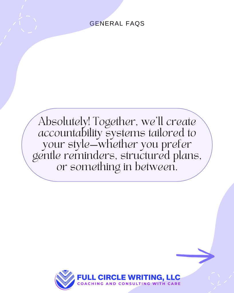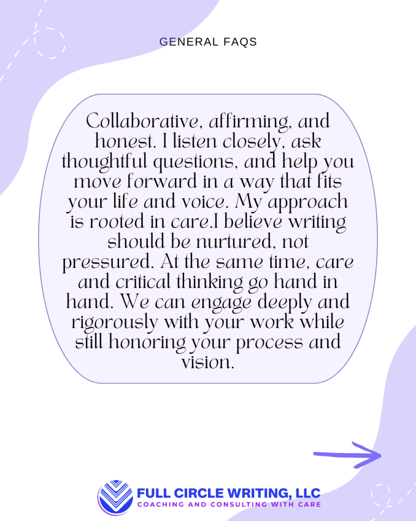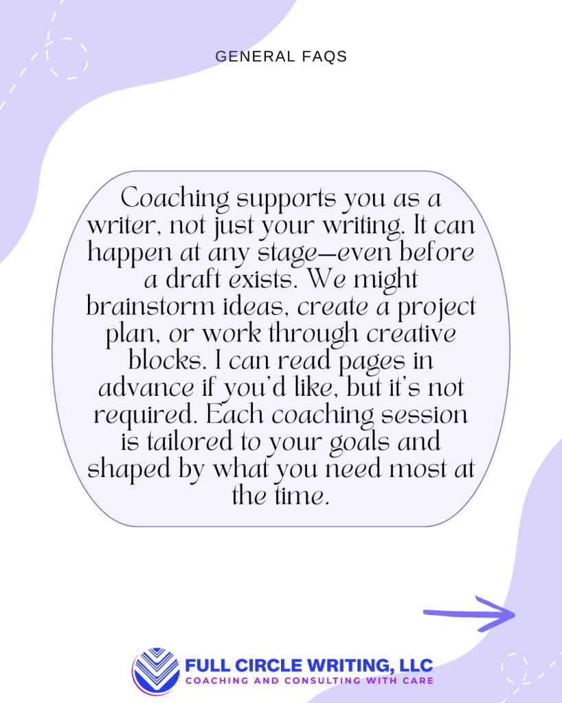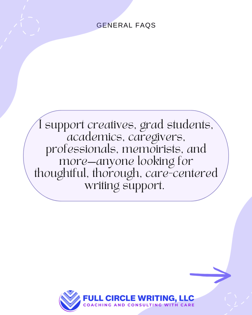 I offer personalized support to help you stay connected to your writing, no matter what season you’re in. Whether you’re balancing caregiving, navigating a career shift, or managing the day-to-day chaos of life, I’m here to help you keep your writing alive. Together, we’ll co-create strategies that align with your priorities, values, and goals. My approach blends guidance, structure, and compassionate accountability to help move your projects forward at a pace that’s sustainable for you.