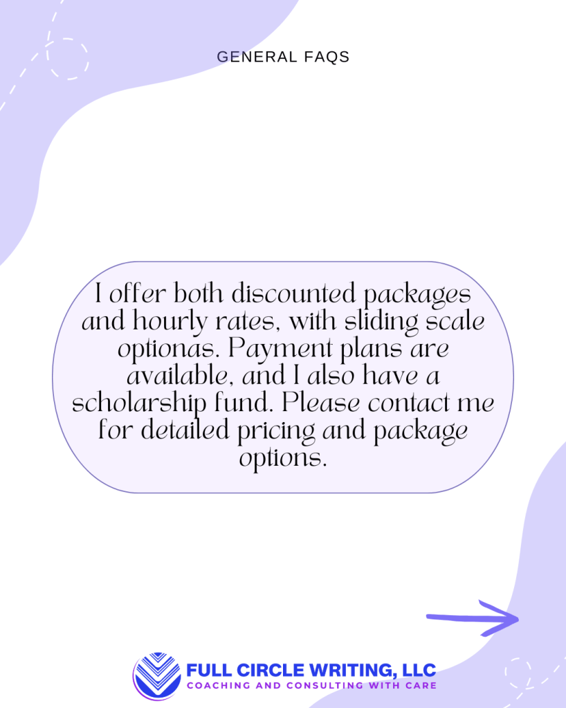 Sliding scale and flexible payment options are available — coaching should be accessible to all writers. Consultations are always free. We’ll talk about your goals and find an approach that works for you.